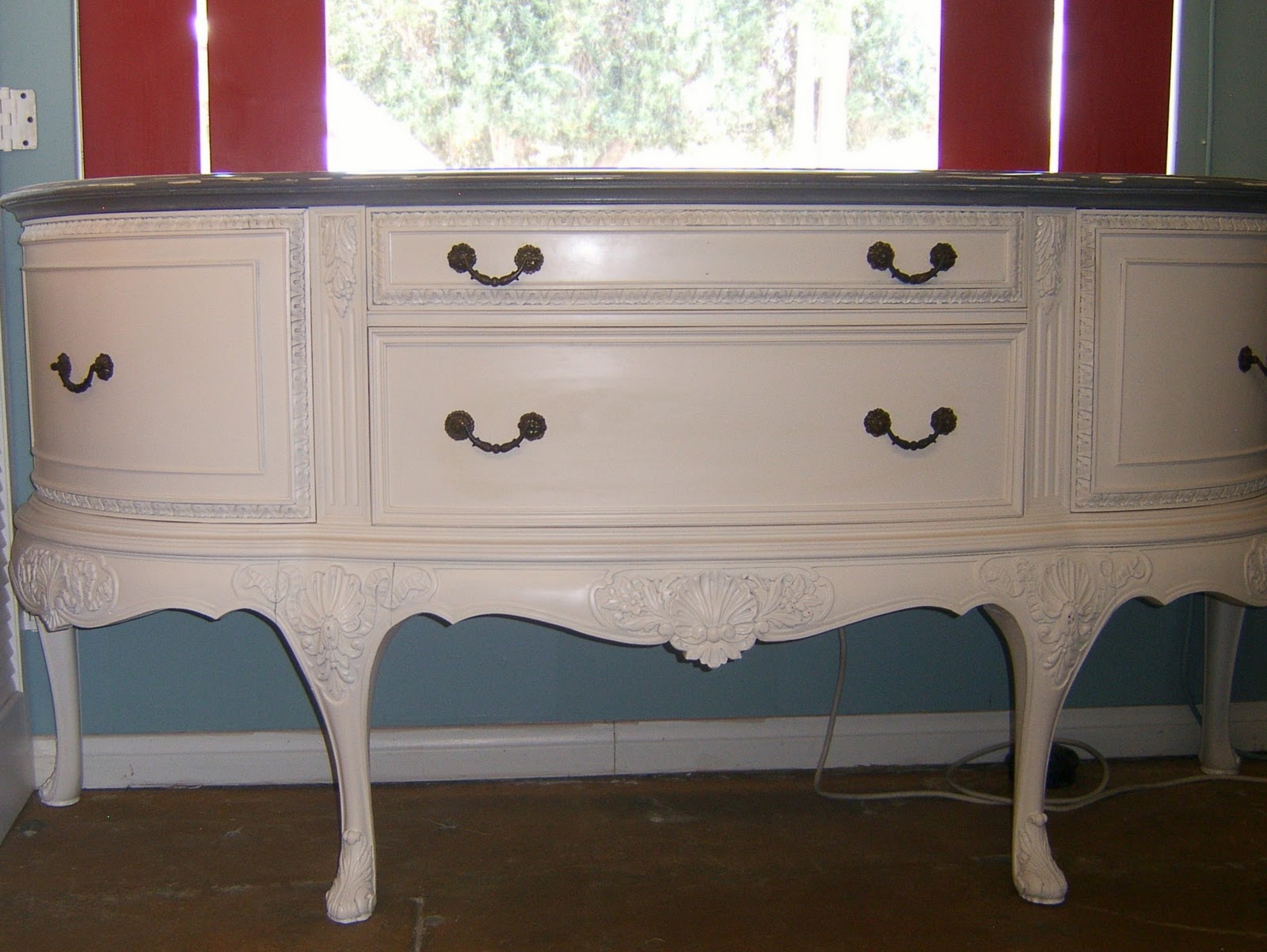 I so wish I had taken before pictures of this beauty. I bought her at a movie prop sale and she hailed from the West Wing television show. She was in dark wood. In the condition she was in I'm not sure if she ever appeared on television, but she must have been part of their prop collection. Her top was badly gouged and could not be refinished without paint because of all the patching my husband had to do. He also had to reset one of the legs to make it sturdy. This buffet was massive measuring in at about 7 feet long. Definitely an estate piece. Steve gave her a good sanding and painted the top with Slate Grey. I wanted her to have the look of a stone top. The sides and front were painted with Heirloom White by American Accents. The old hardware was cleaned up and put back on. Then the top received a smooth as silk French polish. She is just as grand as ever in her newly refined state.